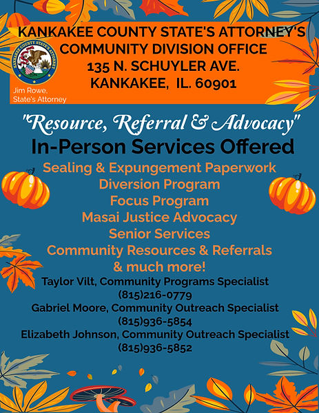 In 2021 the Kankakee County State’s Attorney’s Office was recognized by The Daily Journal as an “Innovator in Social Services”, rare for a prosecutor’s office but a source of pride for our Office. We are consistently looking for opportunities to engage with the community in prevention and intervention efforts, and to build strategic partnerships to address community needs. If you or your agency would like to explore opportunities to improve public safety with our Office, please contact Jim Rowe, State's Attorney, (815)-936-5825 or via email at Jrowe@k3county.net or Carrie Stewart, Kankakee State's Attorney's Community Division Chief, (815)936-5829 or via email at Cstewart@k3county.net.